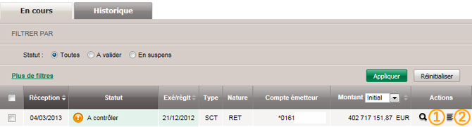 À Contrôler : opération avec une ou plusieurs anomalies (motifs doublon opération et/ou alerte montant et/ou identifiant bénéficiaire absent et/ou alerte bénéficiaire non autorisé). Vous retrouvez le motif de l’anomalie en survolant le statut avec votre souris.