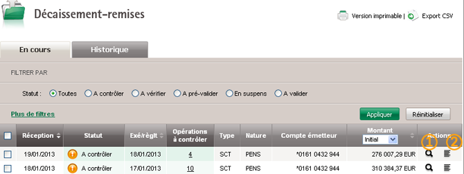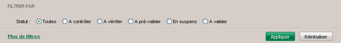Les remises peuvent être filtrées très rapidement selon leurs statuts en sélectionnant le bouton radio du statut souhaité : A valider, En suspens, A pré-valider, A contrôler, A vérifier, puis, en cliquant sur le bouton Appliquer. Les statuts affichés dépendent des options souscrites.