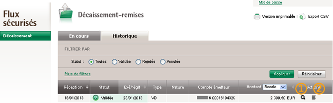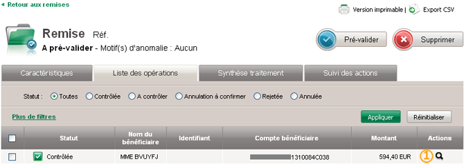 - Pré-valider le traitement d’une ou plusieurs remises au statut A pré-valider (si vous avez souscrit à l’option de traitement de pré validation),