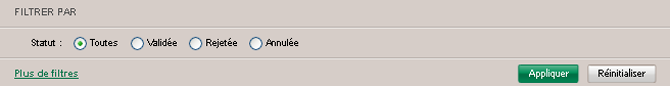 Les opérations peuvent être filtrées très rapidement selon leurs statuts en sélectionnant le bouton radio du statut souhaité : « Annulée, Rejetée, A Contrôler, Contrôlée, Annulation à confirmer » puis en cliquant sur le bouton Appliquer. Les statuts affichés dépendent des options souscrites.